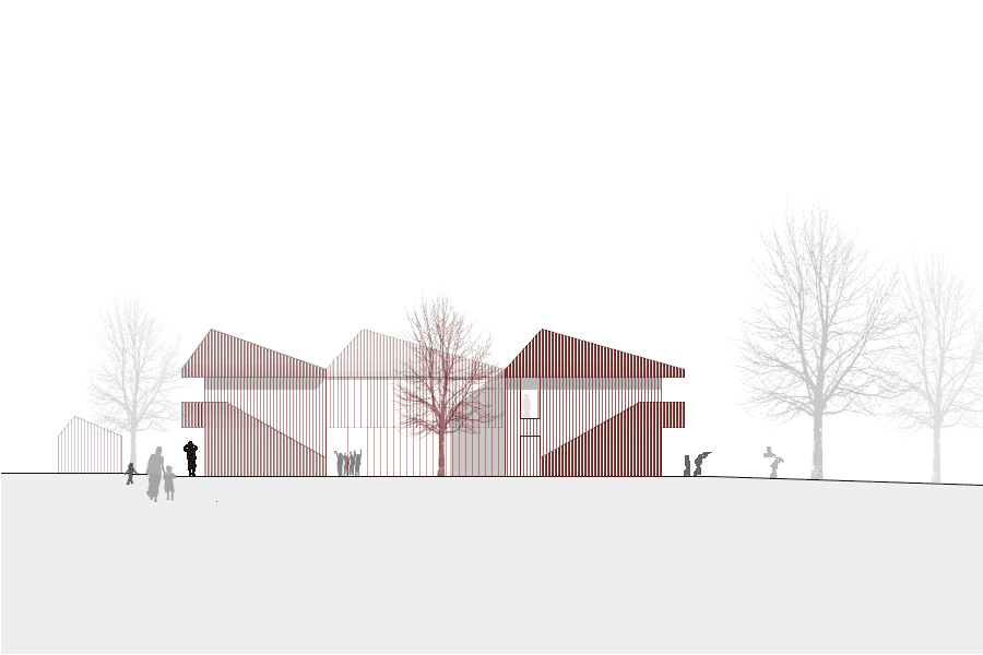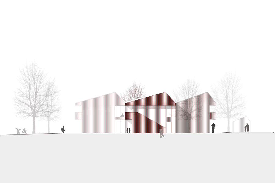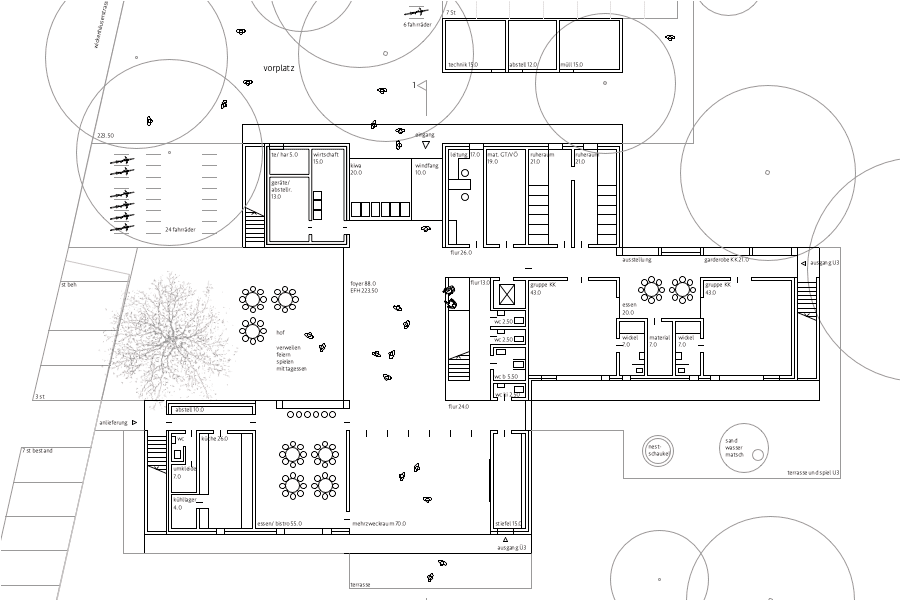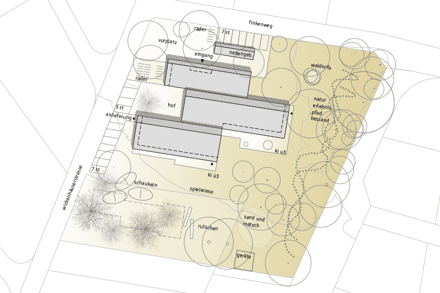 Das Gebäude gliedert sich in drei zueinander versetzte längliche Baukörper die giebelständig zur Straße angesiedelt sind. Die Staffelung der Dachflächen aus der Umgebungsbebauung wird durch Satteldächer aufgenommen. Die Asymmetrie der Dachform unterstreicht die Kleinteiligkeit des Gebäudekomplexes. Das Gebäude betritt man vom Vorplatz aus über einen Windfang der in ein großzügiges Foyer mündet. Nach Westen öffnet sich dieses zu einer Hofsituation, die auch vom Essbereich aus zugänglich ist. Insbesondere im Sommer wird eine qualitätvolle Erweiterungsfläche im beschatteten Hof geschaffen. Im Süden schließt sich an das Foyer der zuschaltbare Mehrzweckraum an, der sich zum Garten hin öffnet und eine hohe Qualität für den Alltag sowie auch Veranstaltungen im Kindergarten bietet.